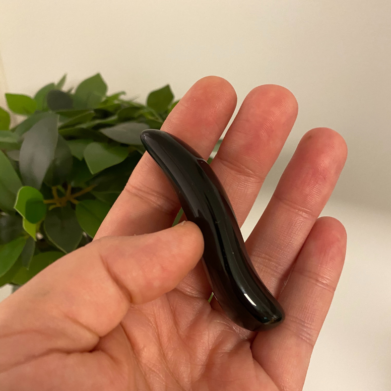 Small tool in black obsidian for treating smaller areas and point treatment of trigger points, acupressure points, and tense areas. The compact size fits comfortably in both small and large hands — a favorite among men as well.
