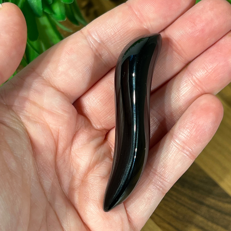 Small tool in black obsidian for treating smaller areas and point treatment of trigger points, acupressure points, and tense areas. The compact size fits comfortably in both small and large hands — a favorite among men as well.